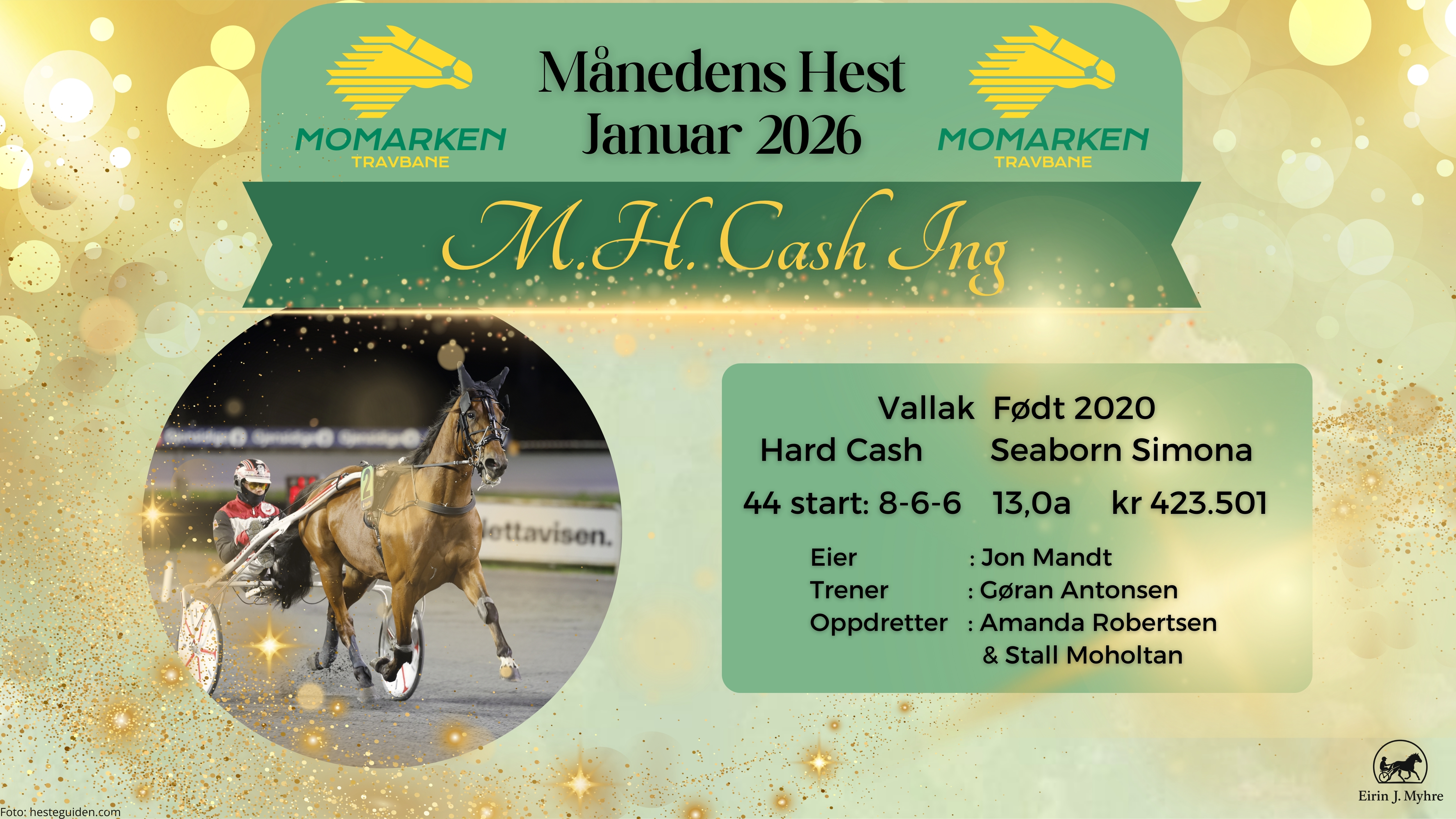 Månedens hest for januar er M.H. Cash Ing, som virkelig har åpnet 2026 på beste vis. Med to seiere allerede i januar har han vist både form, kapasitet og stabilitet, og står igjen som en fortjent vinner av månedens heder. En solid start på året – og et tydelig signal om at dette er en hest det blir spennende å følge videre utover sesongen.