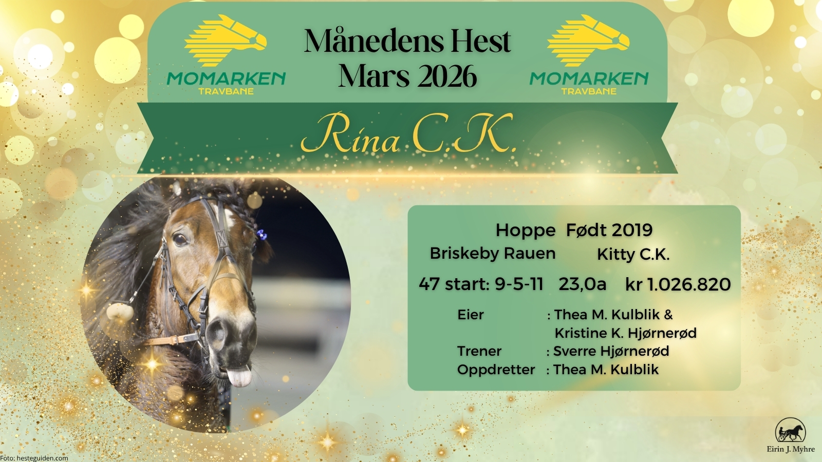 Mars måned ble en jevn måned på resultatfronten for Momarken-regionen, med hele 18 ulike hester som alle kunne vise til én seier hver. Det gjorde valget av månedens hest ekstra vanskelig – men én prestasjon skilte seg likevel ut. Rina C.K. leverte månedens sterkeste enkeltprestasjon, og sikrer seg dermed tittelen som Månedens hest for mars. Seieren kom i et løp med solid førstepremie, og i en måned uten klare «dobbeltvinnere» blir nettopp kvaliteten på prestasjonen avgjørende. Rina C.K. viste både styrke og kapasitet, og bekreftet at hun er en hoppe å regne med fremover.